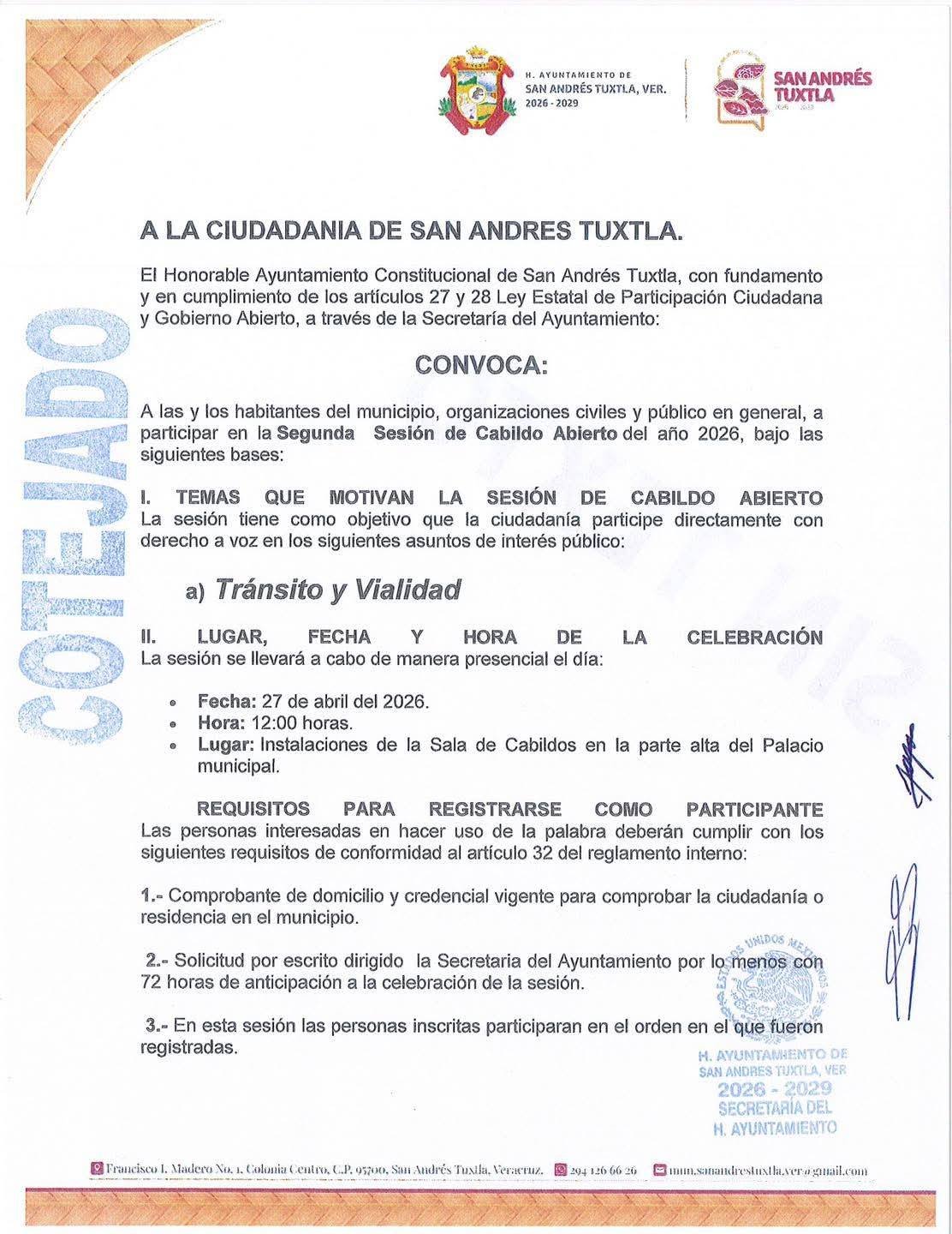 El Ayuntamiento de San Andrés Tuxtla invita a la ciudadanía a participar en la Segunda Sesión de Cabildo Abierto 2026