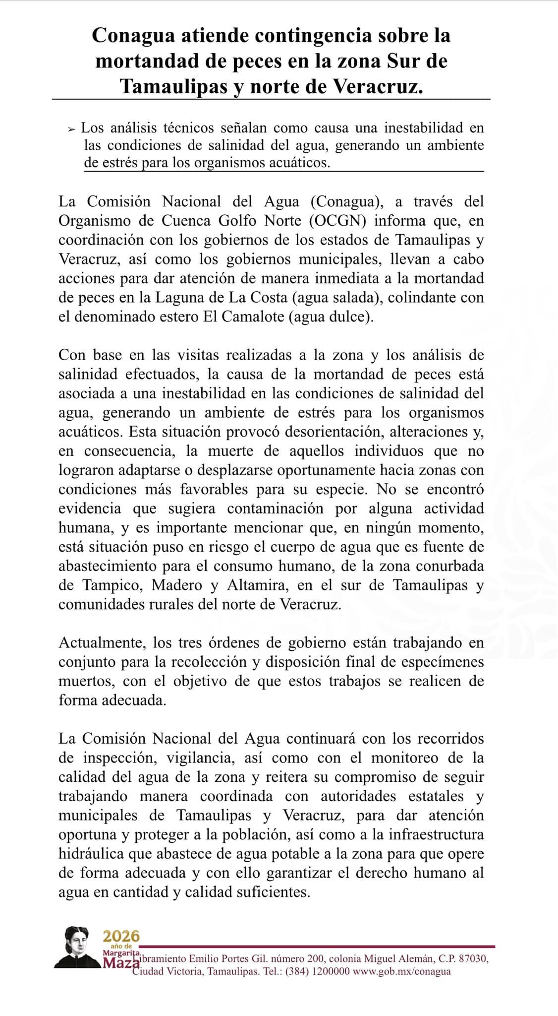 Comunicado La Comisión Nacional del Agua (Conagua), a través del Organismo de Cuenca Golfo Norte…