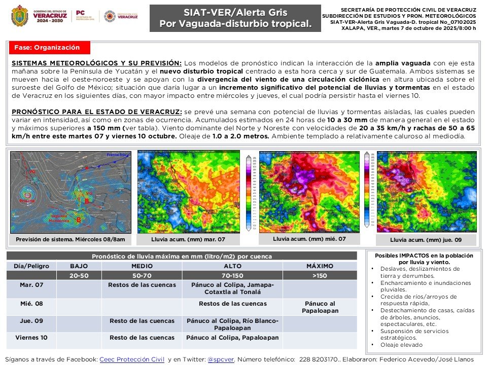 SISTEMAS METEOROLÓGICOS Y SU PREVISIÓN: Los modelos de pronóstico indican la interacción de la amplia vaguada con eje esta mañana sobre la Península de Yucatán y el nuevo disturbio tropical centrado a esta hora cerca y sur de Guatemala. Ambos sistemas se mueven hacia el oeste-noroeste y se apoyan con la divergencia del viento de una circulación ciclónica en altura ubicada sobre el suroeste del Golfo de México; situación que daría lugar a un incremento significativo del potencial de lluvias y tormentas en el estado de Veracruz en los siguientes días, con mayor impacto entre miércoles y jueves, el cual podría persistir hasta el viernes 10.