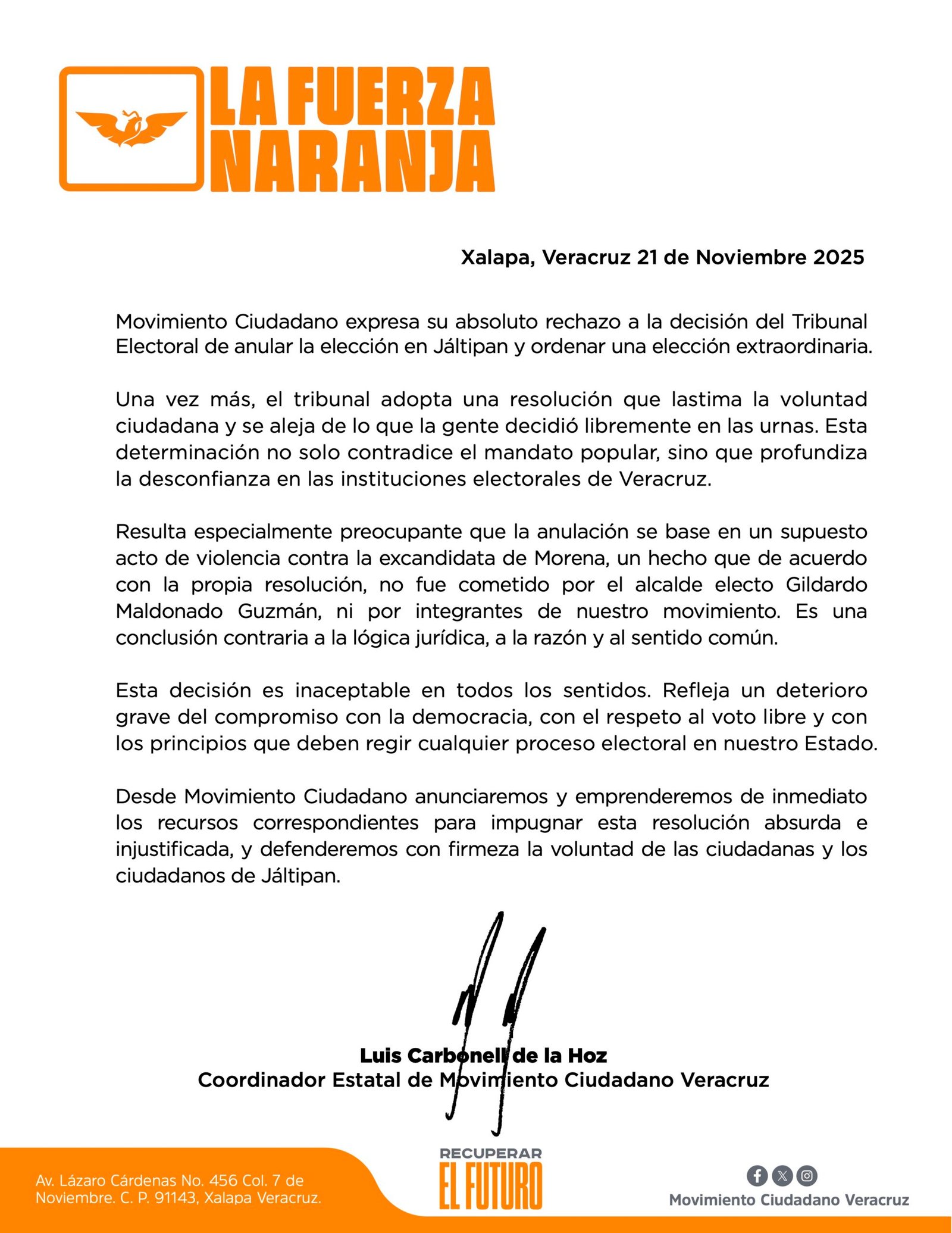 Desde Movimiento Ciudadano anunciaremos y emprenderemos de inmediato los recursos correspondientes para impugnar esta resolución absurda e injustificada, y defenderemos con firmeza la voluntad de las ciudadanas y los ciudadanos de Jáltipan.