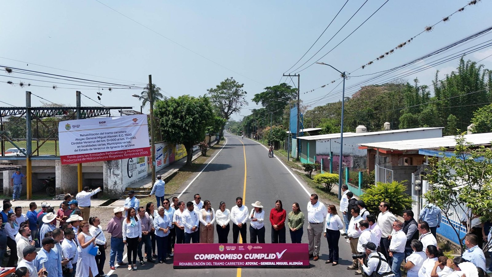 Atoyac, Ver., sábado 25 de abril de 2026.– La gobernadora Rocío Nahle García encabezó la entrega de la rehabilitación del tramo carretero Atoyac – General Miguel Alemán – entronque 150D Córdoba, obra que cumple un compromiso con la población y consolida la presencia de la Cuarta Transformación en la región centro del estado.