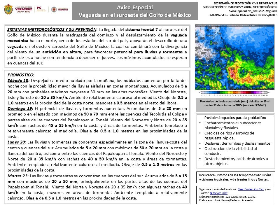 Domingo 19: El potencial de lluvias y tormentas aumentan. Acumulados de 5 a 20 mm en promedio en el estado con máximos de 50 a 70 mm entre las cuencas del Tecolutla al Colipa y partes altas de las cuencas del Papaloapan al Tonalá. Viento del Noroeste y Norte de 20 a 35 km/h con rachas de 45 a 55 km/h en la costa y áreas de tormentas. Ambiente templado a relativamente caluroso al mediodía. Oleaje de 0.5 a 1.0 metros en las proximidades de la costa.