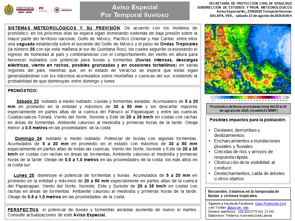 Sábado 23: nublado a medio nublado. Lluvias y tormentas aisladas. Acumulados de 5 a 20 mm en promedio en la entidad y máximos de 30 a 50 mm y sin descartar mayores especialmente en partes altas de la cuenca del Pánuco al Papaloapan y entre las cuencas Coatzacoalcos-Tonalá. Viento del Norte, Noreste y Este de 20 a 35 km/h en costas con rachas en áreas de tormentas. Ambiente caluroso al mediodía y primeras horas de la tarde. Oleaje menor a 0.5 metros en las proximidades de la costa.