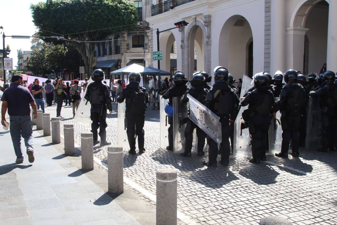 Jubilados que se manifestaban y bloqueaban el centro de Xalapa para exigir el pago de seguros institucionales fueron amagados por elementos policíacos.