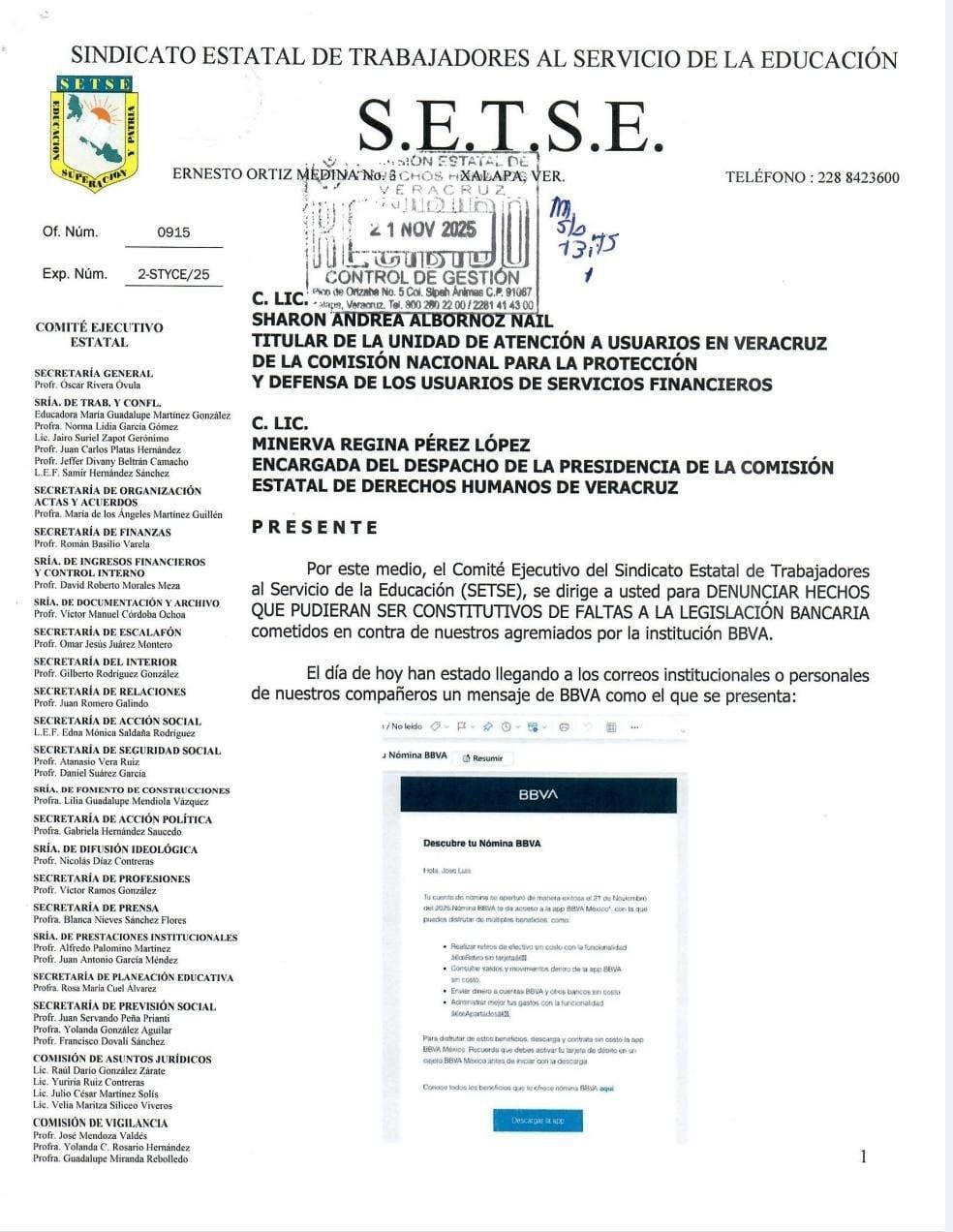 El Sindicato Estatal de Trabajadores al Servicio de la Educación (SETSE), encabezado por el profesor Óscar Rivera Ochoa, denunció que el banco BBVA presuntamente estaría generando cuentas de nómina sin consentimiento de empleados de la Secretaría de Educación de Veracruz (SEV), lo que podría constituir violaciones a disposiciones bancarias, normativas financieras y derechos humanos.