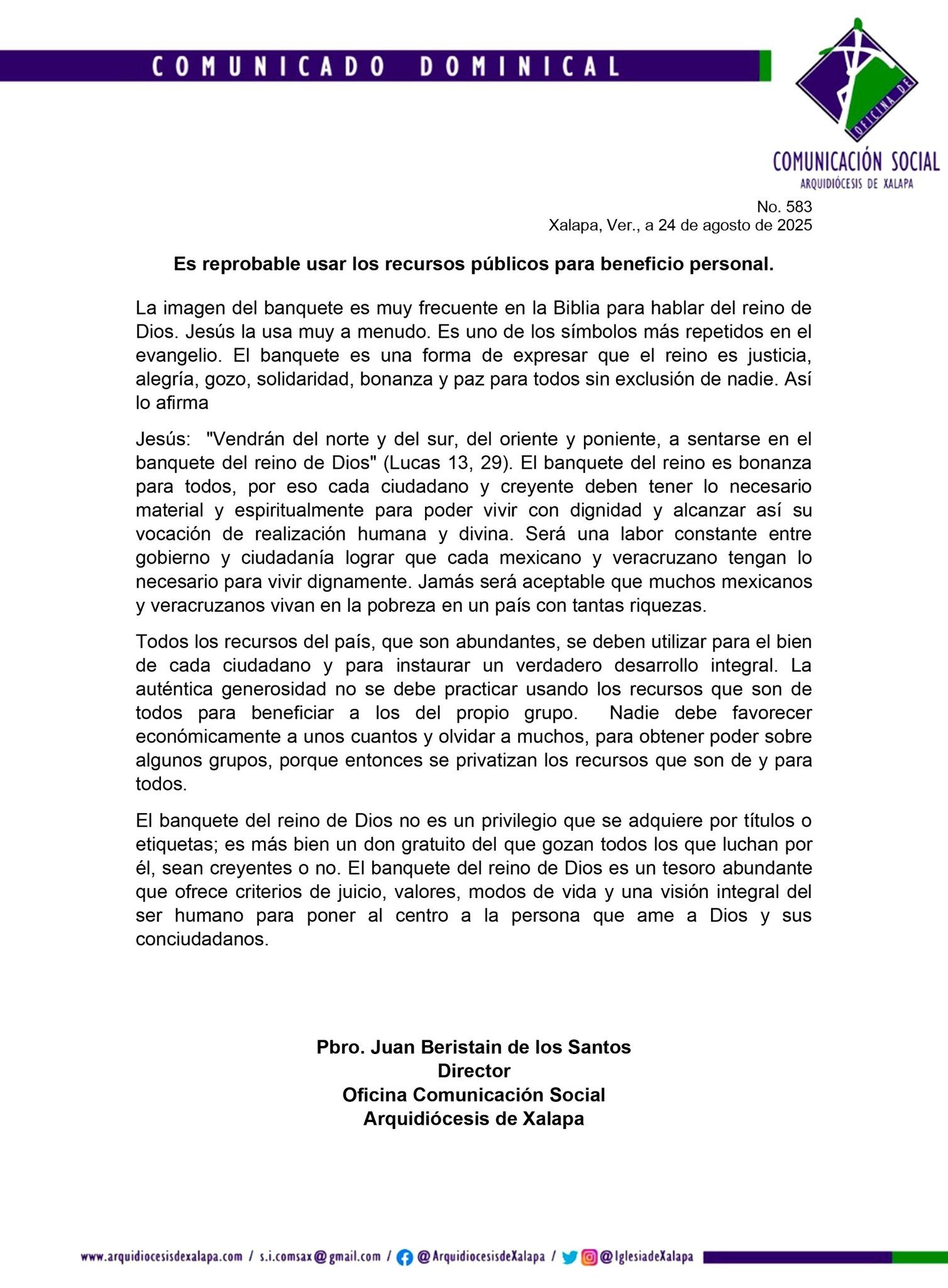 Jesús: «Vendrán del norte y del sur, del oriente y poniente, a sentarse en el banquete del reino de Dios» (Lucas 13, 29). El banquete del reino es bonanza para todos, por eso cada ciudadano y creyente deben tener lo necesario material y espiritualmente para poder vivir con dignidad y alcanzar así su vocación de realización humana y divina. Será una labor constante entre gobierno y ciudadanía lograr que cada mexicano y veracruzano tengan lo necesario para vivir dignamente. Jamás será aceptable que muchos mexicanos y veracruzanos vivan en la pobreza en un pais con tantas riquezas.