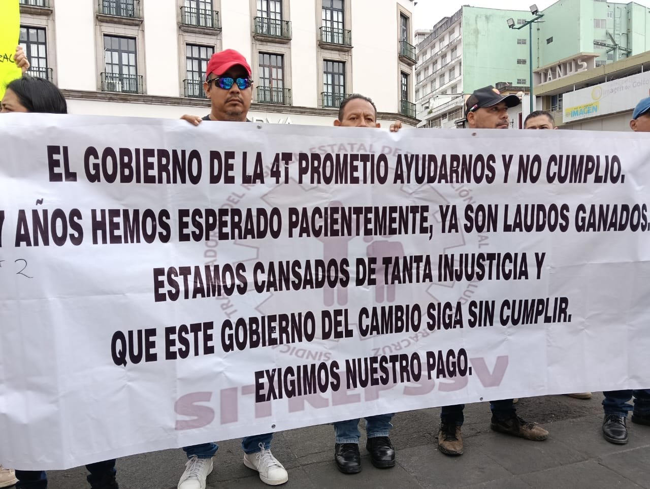 Ex trabajadores del extinto Seguro Popular en Plaza Lerdo de Xalapa exigieron el pago de laudos laborales que, aseguran, llevan casi una década esperando.