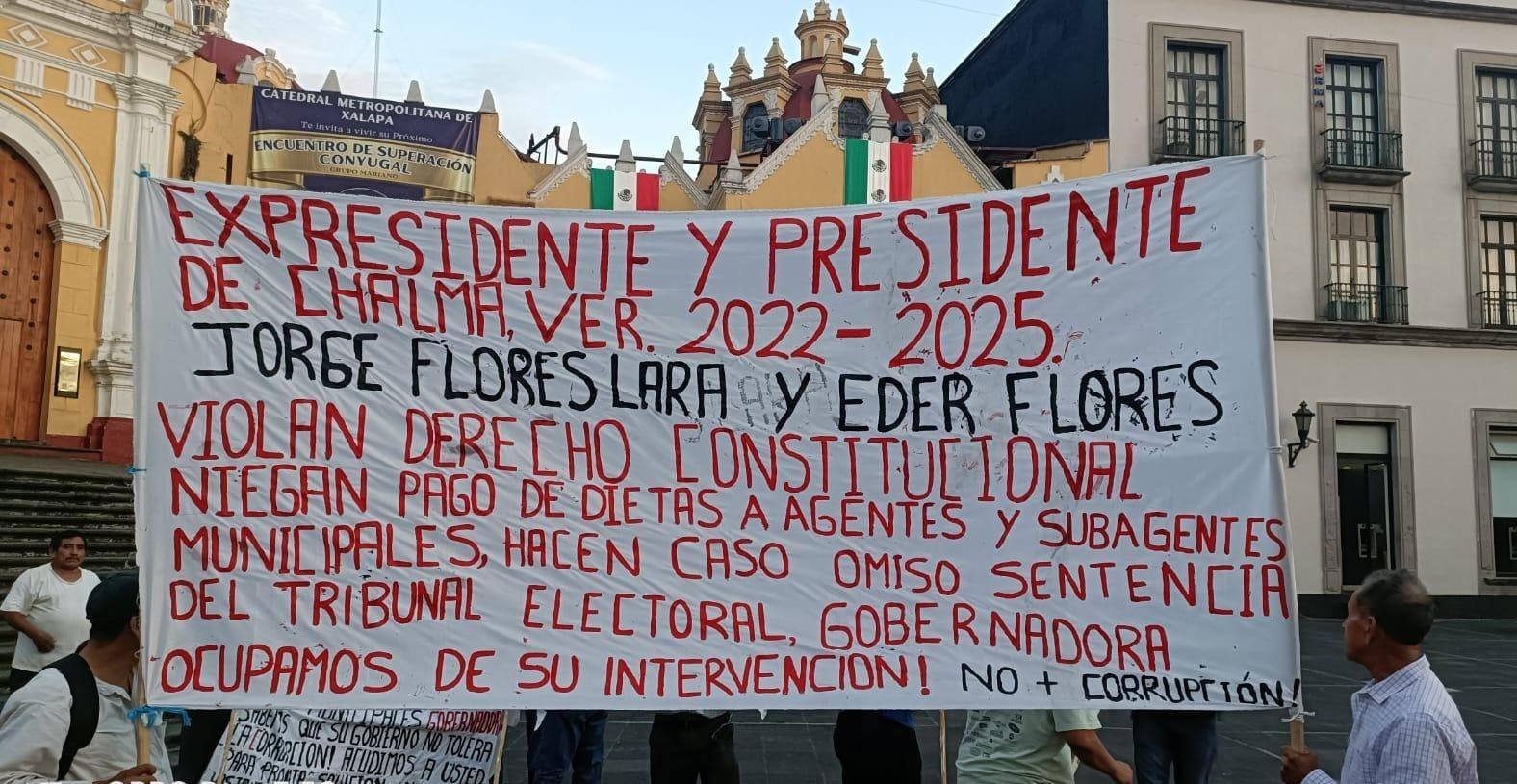 Agentes municipales del municipio de Chalma se manifestaron en la plaza Lerdo de Xalapa para exigir el pago de sus remuneraciones, que datan desde 2022 hasta 2025.