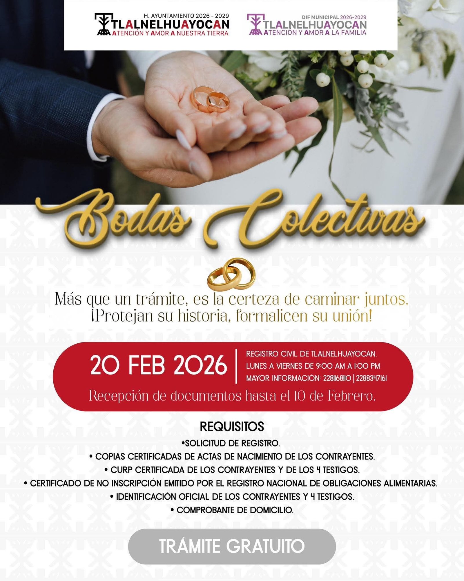 El DIF Municipal en coordinación con el Registro Civil y el Ayuntamiento de Tlalnelhuayocan, invitan a las parejas del municipio que desean formalizar su unión a inscribirse en el programa de Bodas Colectivas 2026.