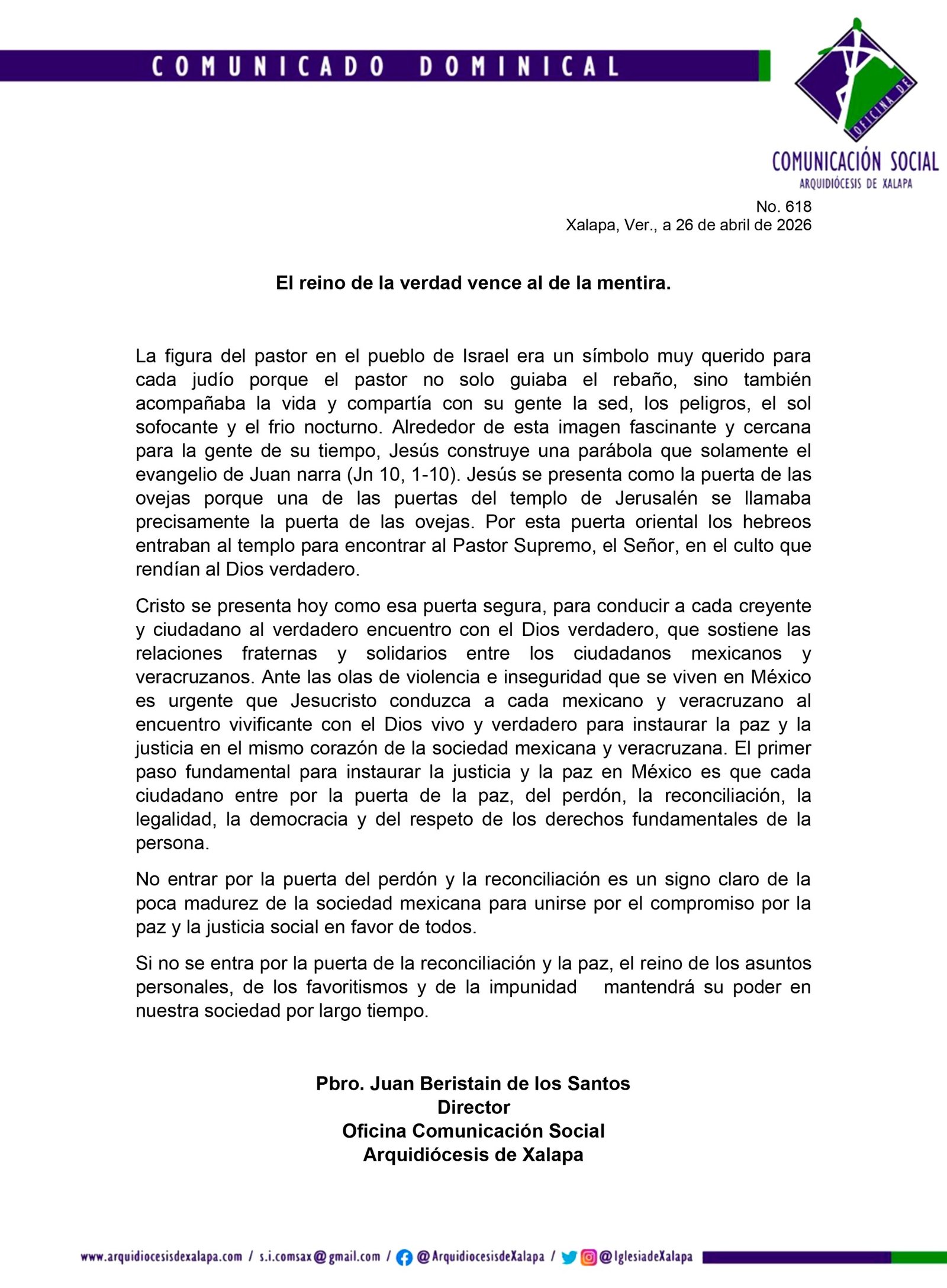 Cristo se presenta hoy como esa puerta segura, para conducir a cada creyente y ciudadano al verdadero encuentro con el Dios verdadero, que sostiene las relaciones fraternas y solidarios entre los ciudadanos mexicanos y veracruzanos.