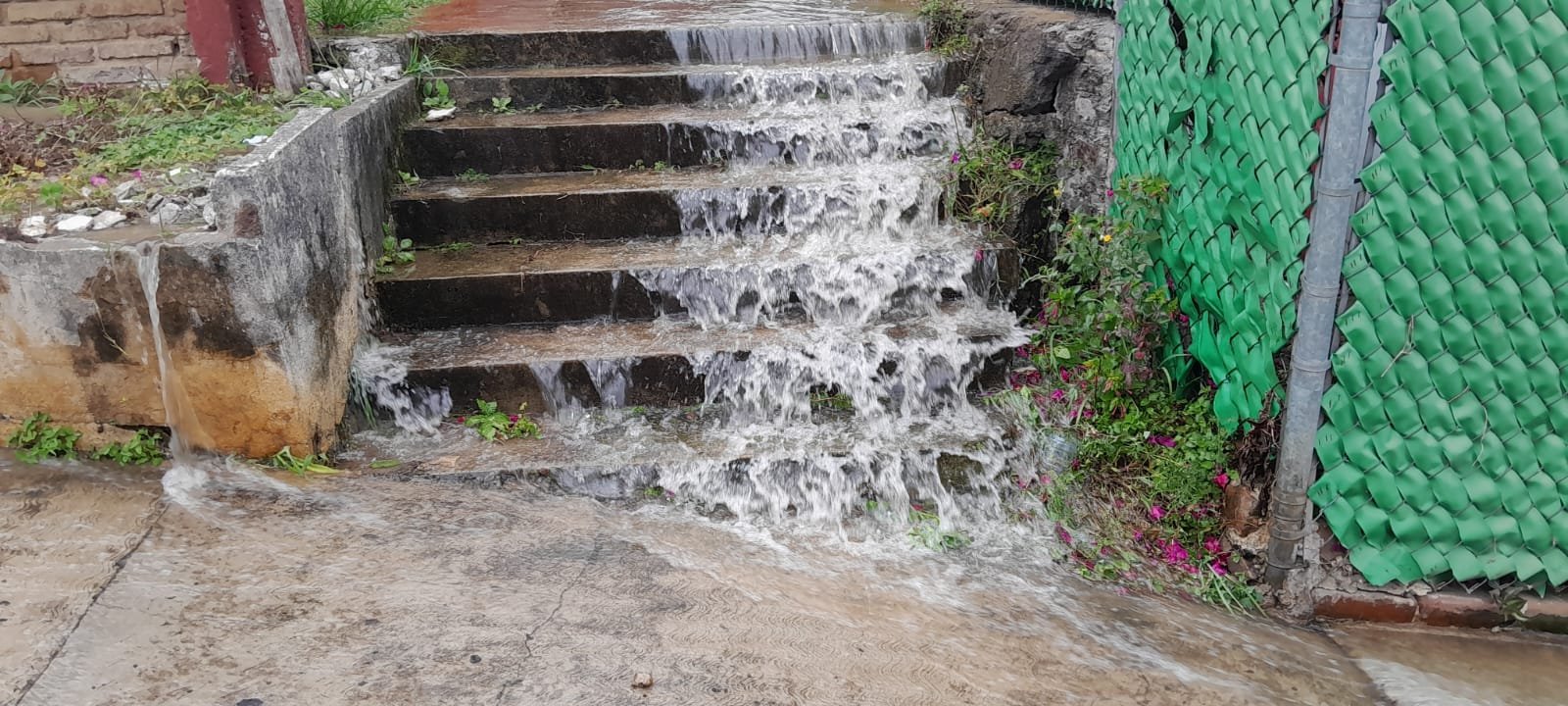 Este jueves 15 de enero, la situación se agravó al romperse presuntamente una tubería, lo que generó un escurrimiento continuo de agua que corre por pasillos y escalinatas de la zona, formando una verdadera caída de agua visible desde varios puntos del fraccionamiento.
