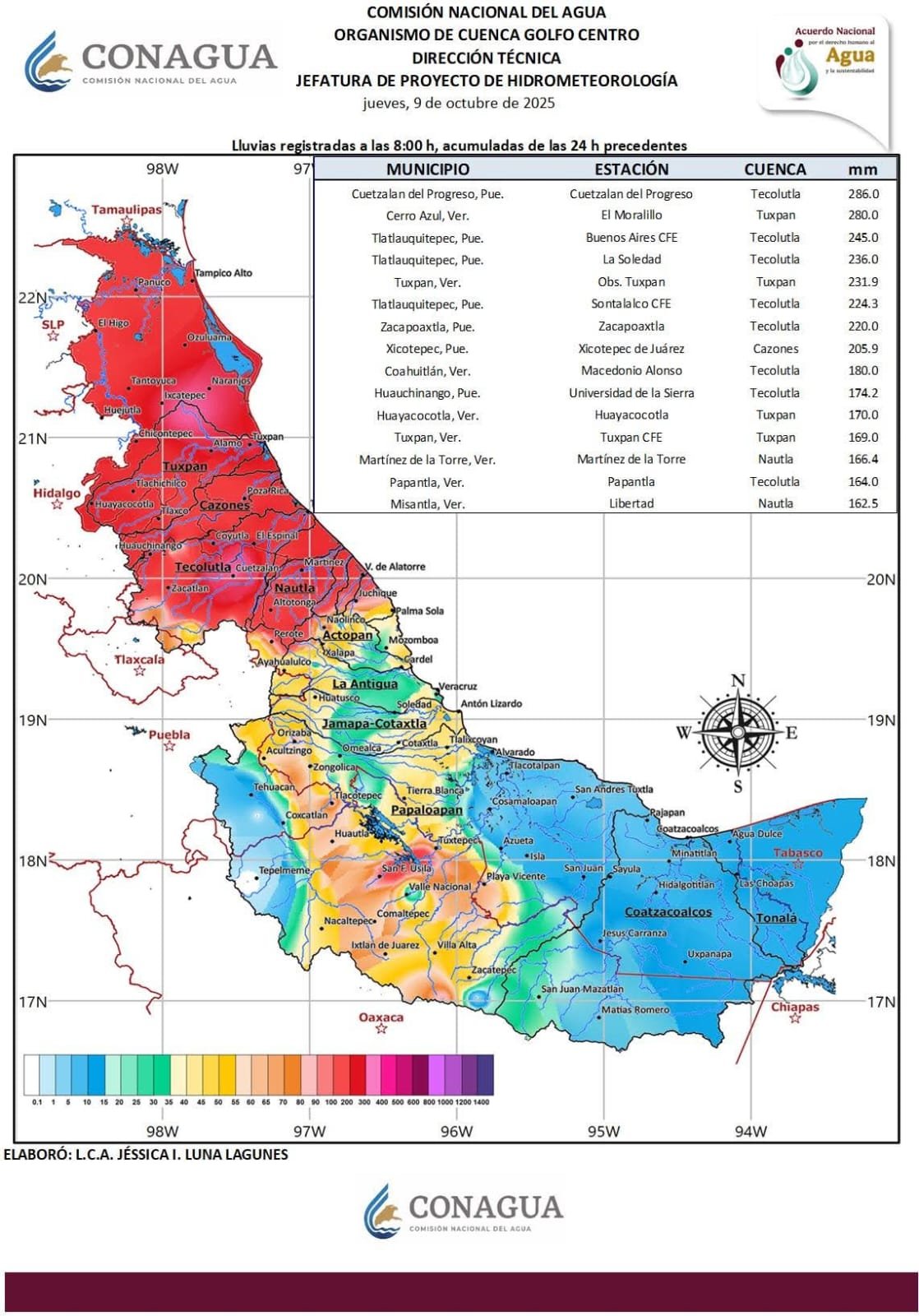 La Jefa del Proyecto de Hidrometeorología del Organismo de Cuenca Golfo Centro de la Comisión Nacional del Agua (CONAGUA), Jessica Iveth Luna Lagunes emitió un informe sobre el estado de los ríos y arroyos en Veracruz, donde se registran desbordamientos e incrementos en los niveles de agua debido a las lluvias acumuladas en las últimas 24 horas de 8 a 8.