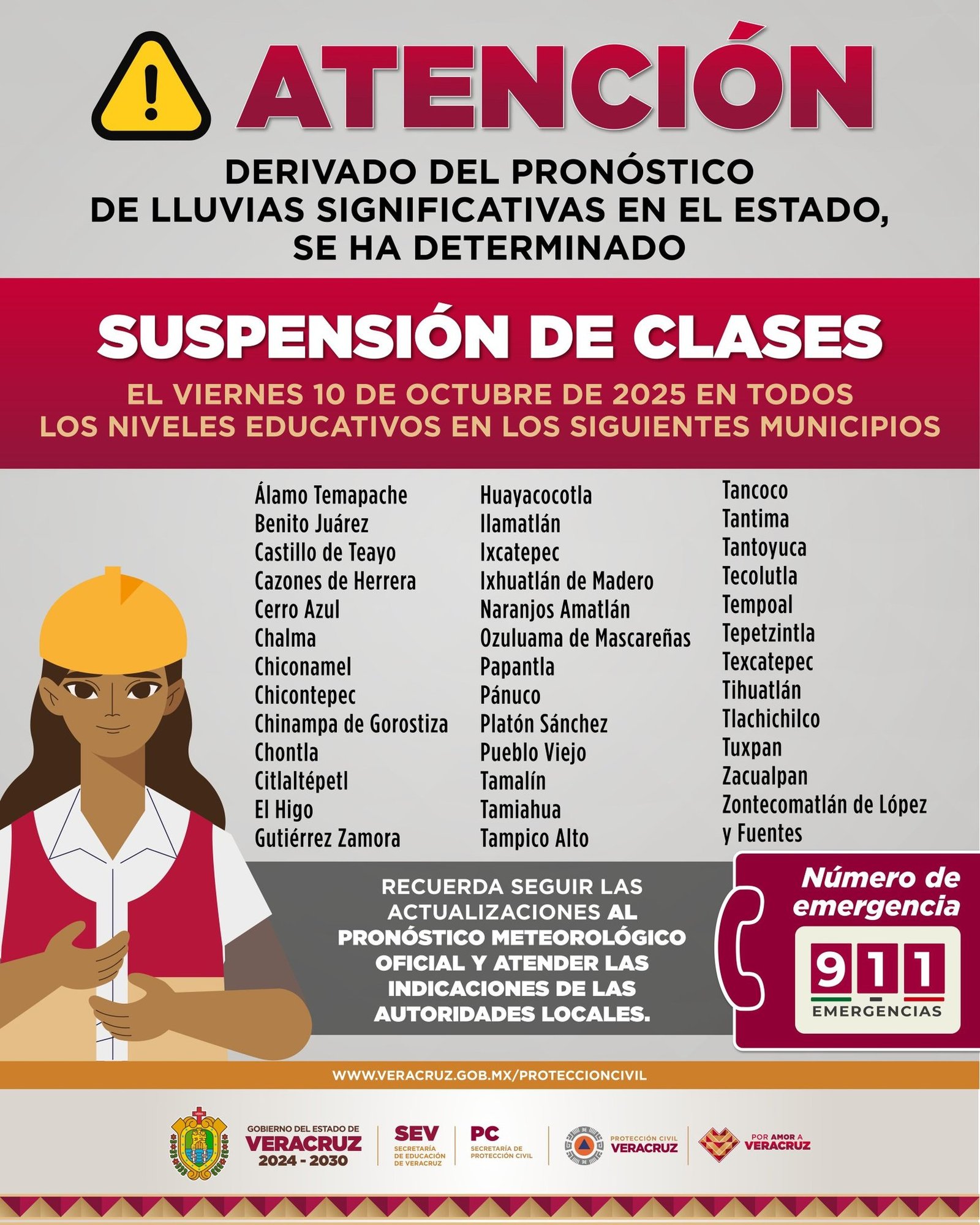 La Secretaría de Protección Civil mantiene activa la Alerta Gris del SIAT-Ver en Fase de Acción, con fuerzas de tarea de los tres órdenes de gobierno desplegadas en las zonas de mayor vulnerabilidad para atender de manera oportuna cualquier emergencia y salvaguardar la integridad de la comunidad educativa y prevenir riesgos.
